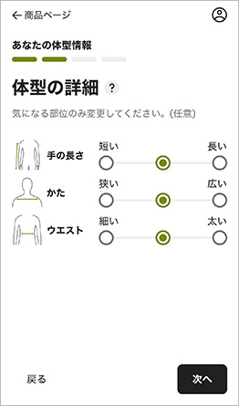 ③. 選んだアイテムの推奨サイズや、着用イメージがシルエットで表示