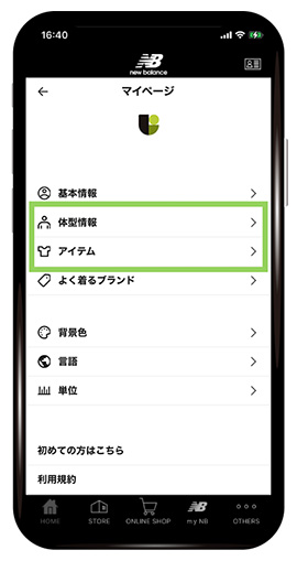画面左上の『メニュー』から、お客様の体型情報の編集や、お持ちのアイテムの登録をすることができます。